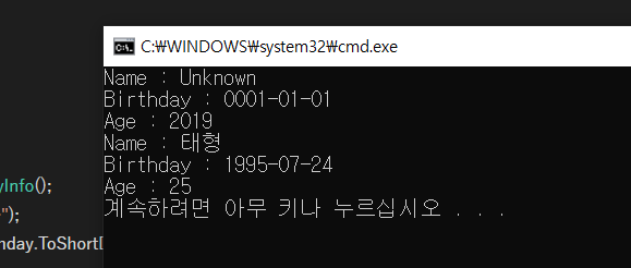 WriteLine($"Birthday : {birth.Birthday.ToShortDateString()}");
