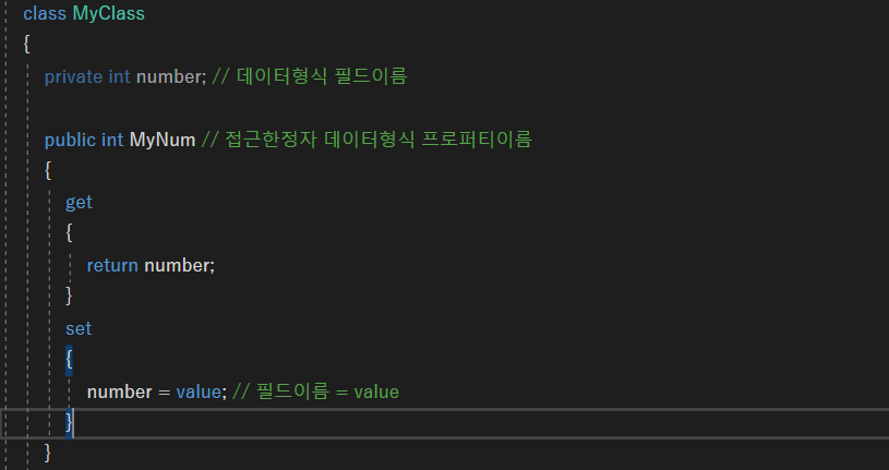 프로퍼티 선언 문법에서 get과 set을 일컬어 '접근자'라고 한다. get 접근자는 필드로부터 값을 읽어오고 set 접근자는 필드에 값을 할당한다. set 접근자 안에 있는 'value' 키워드에 주목할 필요가 있는데, 비록 프로그래머가 선언한 적이 없지만 C# 컴파일러는 set접근자의 암묵적 매개변수로 간주하기 때문에 아무런 문제를 삼지 않는다.
