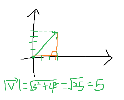 즉, 피타고라스의 정리를 사용하면 벡터의 길이(크기)를 구할 수 있다. 그래서 위 v 벡터의 크기는 5이며,