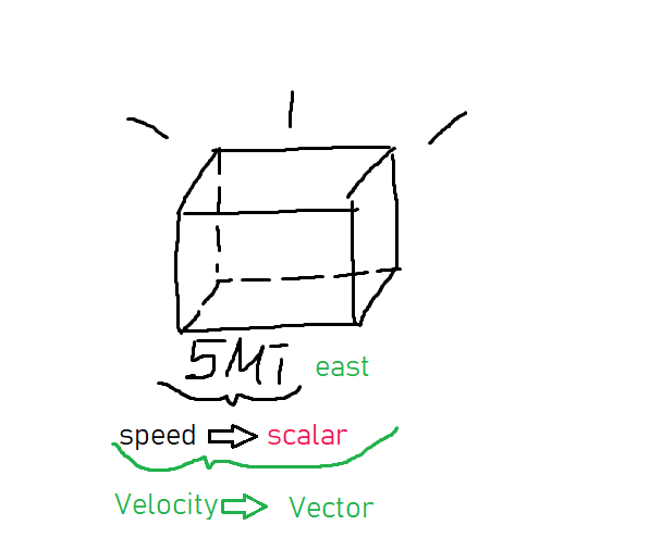 하지만 이 물체가 어느 방향으로 시속 5마일을 움직이는지 알 수 없다. 속력이라고 불리는 이 수치는 그 자체로는 벡터가 아니다. 이것은 앞에서 설명한 스칼라이다. 위 값이 벡터가 되기 위해서는 방향을 가져야 한다.
