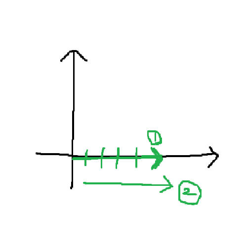 위 값을 5의 크기로 가지는 화살표로 나타낸 것이다. 여기 표현된 크기는 크기의 단위마다 시간당 속력을 나타낸다. 그리고 방향은 오른쪽을 향한다. 즉, 동쪽이다. 그렇다면 원점에서 시작해 오른쪽으로 길이가 5인 화살표(1번 벡터)를 그릴 수 있다. 화살표의 길이는 속력을 나타낸다. 길이가 1,2,3,4,5 그리고 화살표가 가리키는 방향이 있다. 위에 보이는 것이 벡터를 표현했다고 볼 수 있다. 또한 벡터의 장점은 옮길 수 있다는 것인데, 2번 벡터와 1번 벡터는 정확히 같은 벡터이다.