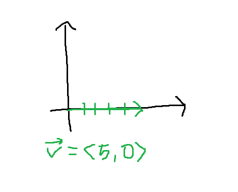 일반적으로 2차원이라면 숫자 두개로 벡터를 표현할 수 있는데, 각 차원에 대해서 얼마만큼 움직였는지로 표현한다. 이 물체는 오직 수평축으로만 움직였고 수평축을 먼저 표기하여 <5,0>이라고 표현할 수 있다. 수평축 + 방향으로 5만큼 움직이며, 수직축 방향으로는 움직이지 않는다는 걸 나타낸다.