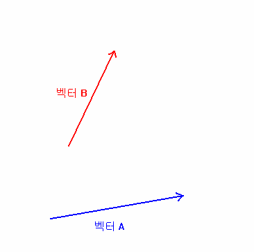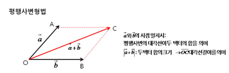 위 삼각형법은 꼬리와 머리를 연결했지만 평행사변형법으로 나타낼 시 a벡터와 b벡터의 시작점이 일치해야 한다는 것이다. 즉, 시작점이 같았을 때 평행사변형의 대각 선분이 두 벡터의 합이다.