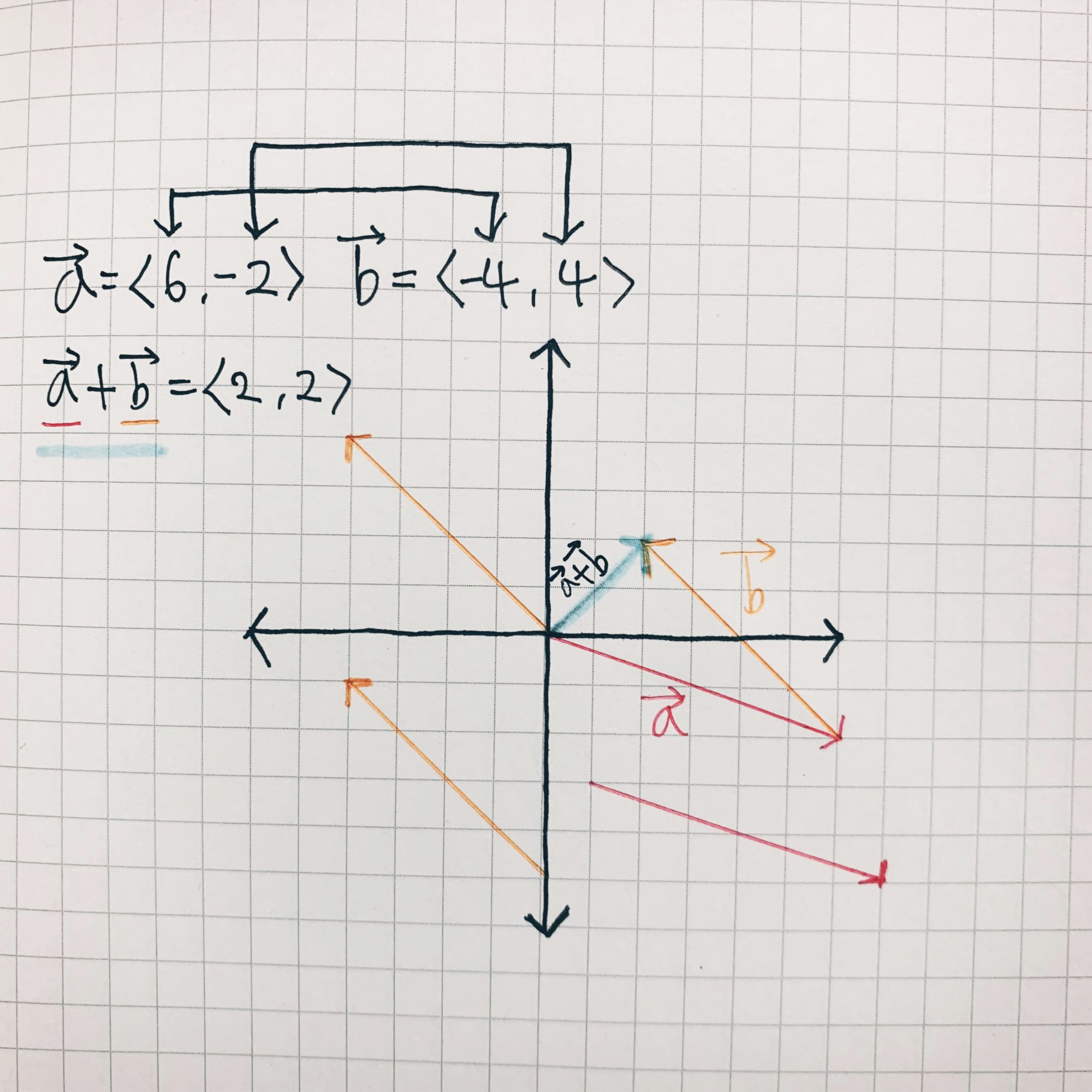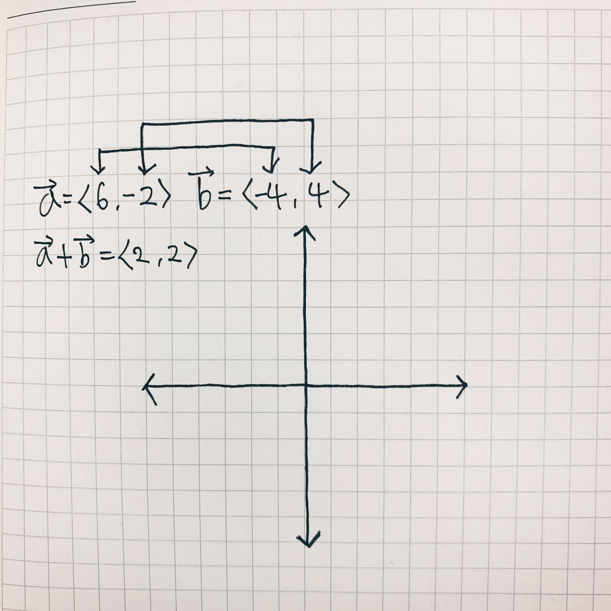 위 그림에 보이는 a 벡터와 b 벡터가 있다. 각각 a 벡터는 <-6,2> , b 벡터는 <-4,4>의 성분을 가지고 있으며, 두 벡터 모두 2차원 벡터임을 알 수 있다. 그래서 본능적으로 자리끼리 더할 수 있다는 것 또한 알 수 있다. 두 벡터를 더한 값은 <2,2>가 나오며, 2차원 벡터이다. 빼기도 마찬가지이다. 이것을 시각화시켜본다면
