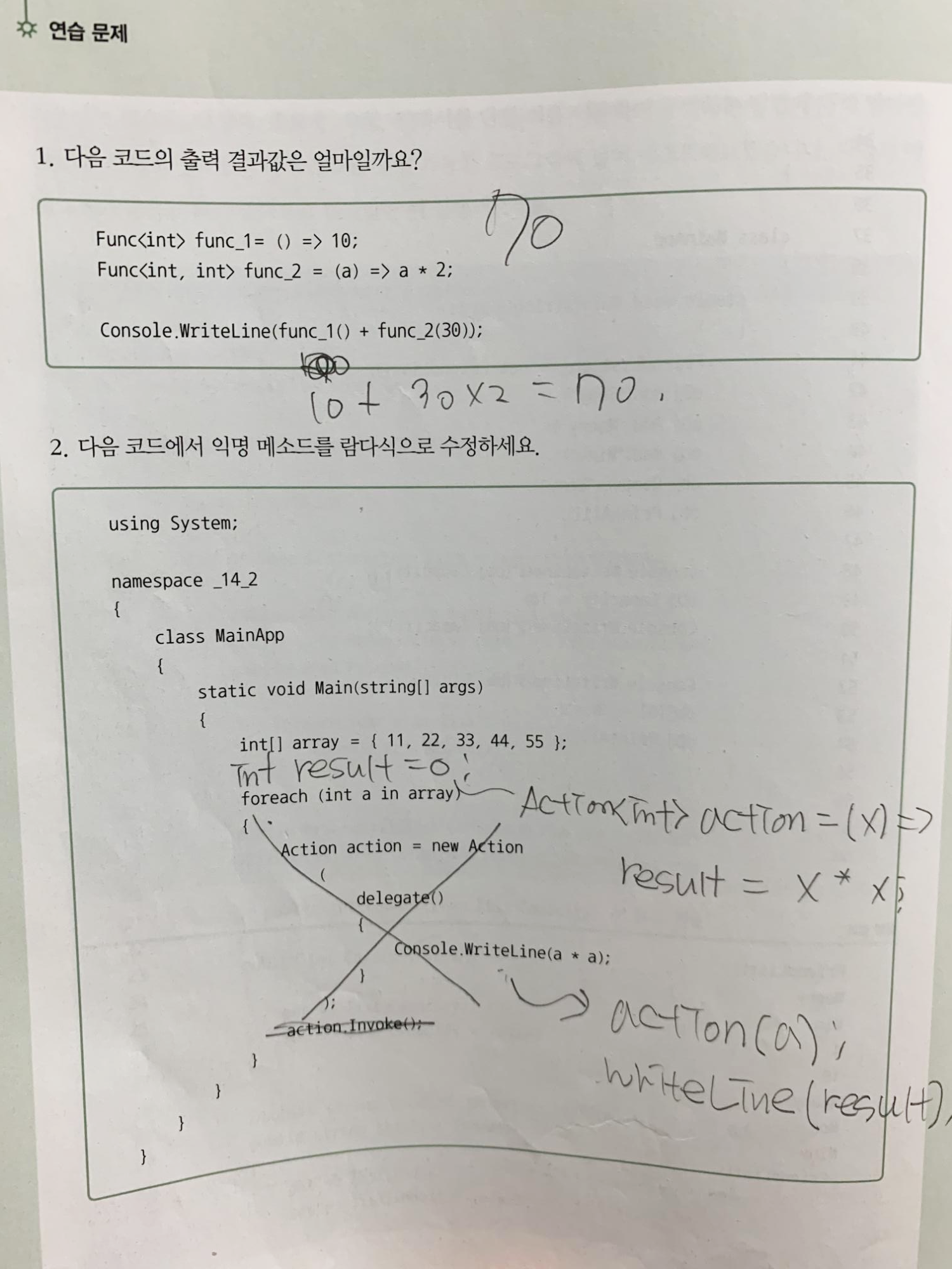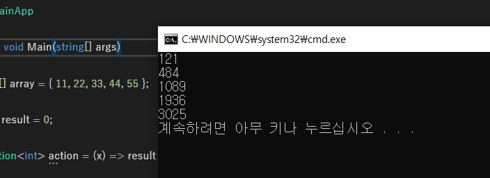 Action<int> action = (x) => result = x * x; // 람다식 밖에 선언한 result에 x*x의 값을 저장
