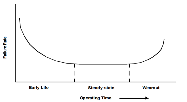 '욕조 곡선'이다. 이것은 하드웨어의 고장률을 시간 함수로 보여주는 그림으로 초기에는 고장률이 높고 수정을 거듭하며 안정기에 접어들었다가 오랜 시간이 지나면 부품이 마모되므로 고장률이 다시 높아진다.