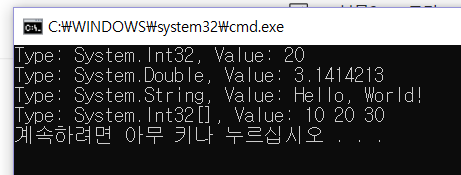 WriteLine("Type: {0}, Value: {1}", a.GetType(), a);