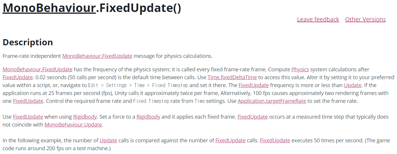 FixedUpdate - FixedUpdate도 Update와 마찬가지로 프레임마다 보통 여러 번 불리게 된다. 하지만 각각의 호출은 고정된 시간 간격을 기반으로 규칙적으로 표준화되어 일어난다. 가장 흔히 사용하는 경우는 유니티의 물리 기능을 사용할 때다. 시간에 따라 Rigidbody 컴포넌트의 속도나 속성을 업데이트하는 경우 Update보다 FixedUpdate가 더 적합하다.