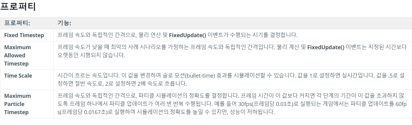 Time Manager(메뉴: Edit > Project Settings > Time)를 사용하여 게임 내에서 타이밍을 제어하는 여러 프로퍼티를 설정할 수 있다.