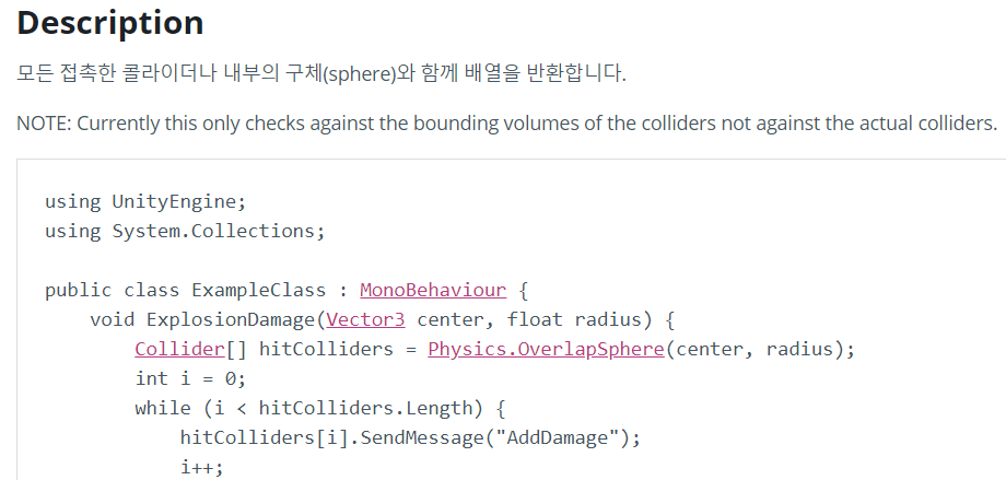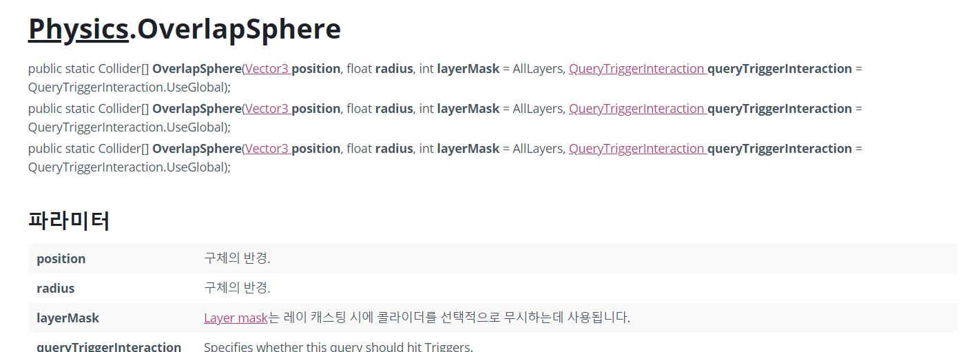 Physics.OverlapSphere - 중점과 반지름으로 가상의 원을 만들어 추출하려는 반경 이내에 들어와 있는 콜라이더들을 반환하는 함수 함수의 반환 값은 Collider 컴포넌트의 배열로 넘어옵니다. 또한 OverlapSphere 함수는 특정 레이어만 검출할 수도 있어요.