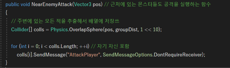위 예제는 주변 동료 몬스터가 공격당했을 때 같이 공격 태세로 전환하기 위한 코드입니다. 특정 레이어만 검출할 수 있도록 "ENEMY" 레이어를 추가했으며, 레이어는 비트 연산 표기법을 사용해서 10번째 레이어를 의미하는 1 << 10을 사용했으며, for 문으로 처음부터 배열의 마지막까지 순회하면 플레이어 공격 상태로 바꿔줍니다. 게임에서 순간 판정이 필요할 때 아주 유용한 함수.