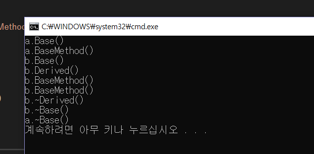 base.BaseMethod(); // base 키워드를 통해 기반 클래에 접근 가능.