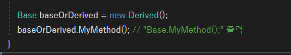 기반 클래스에는 아무 생각없이 메서드를 구현해도 메서드 숨기기를 하면 오버 라이딩과 같은 효과를 얻을 수 있다. 하지만 메서드 숨기기는 오버 라이딩과 다르다. 이름 그대로 메서드를 숨기고 있을 뿐 객체를 선언하면 CLR에게 Base 버전의 MyMethod()가 노출되어 이를 실행하게 된다.