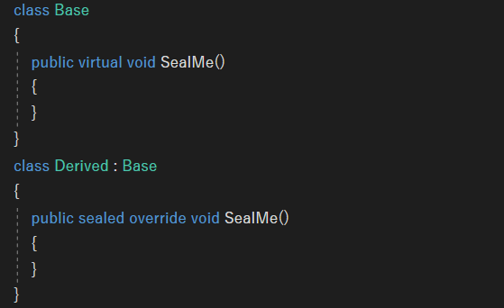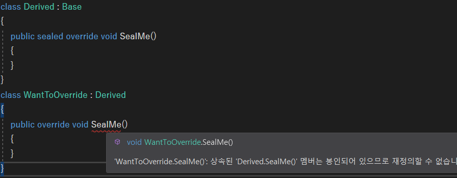 메서드도 오버 라이딩되지 않도록 봉인할 수 있다. virtual로 선언된 가상 메서드를 오버 라이딩한 버전의 메서드만이 가능하다.