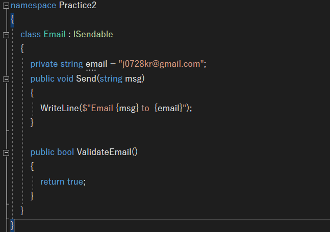 인터페이스는 인스턴스는 만들 수 없지만, 참조는 만들 수 있다. 이 참조에 Email 클래스(파생 클래스)의 객체의 위치를 담는다. 파생 클래스는 부모 클래스와 같은 형식으로 간주하기 때문에, 인터페이스와 인터페이스로부터 상속받는 클래스의 관계에도 그대로 적용된다.