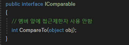 인터페이스는 C# 키워드 interface를 사용하여 정의한다. 인터페이스 정의 시에는 내부 멤버들에 대해 public과 같은 접근 제한자를 사용하지 않는다.