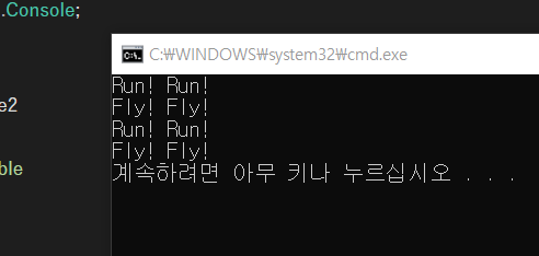 FlyingCar의 인스턴스를 만들어서 Run과 Fly를 호출하면 실제 메소드의 내용이 호출이 된다.