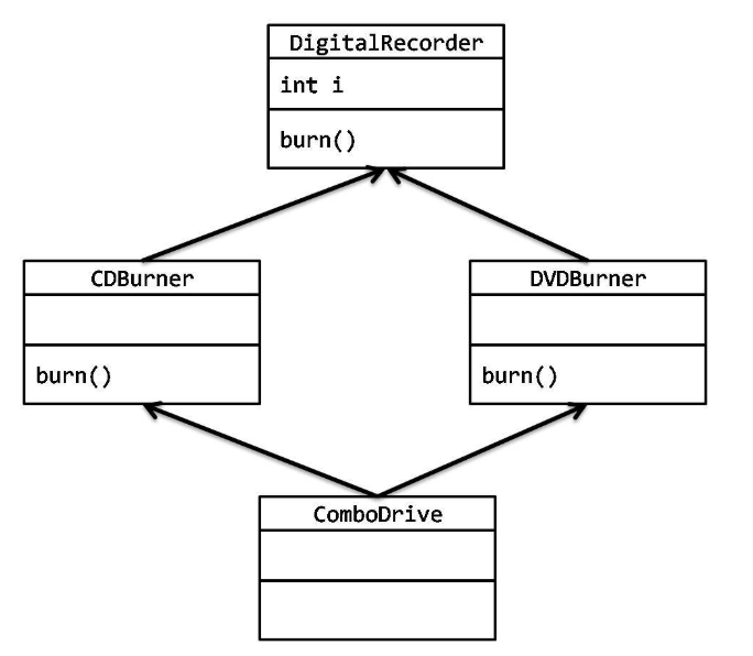 위 그림처럼 ComboDrive가 어느 burn() 메서드를 물려받을지 모호하다는 것이다. 상속은 객체지향에서 없어서는 안 될 요소중 하나이지만 단점과 허점도 존재하는 속성이다.